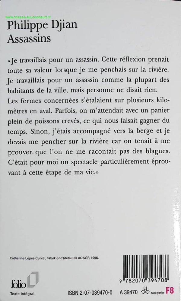 "Je travaillais pour un assassin. Cette réflexion prenait toute sa valeur lorsque je me penchais sur la rivière. Je travaillais pour un assassin comme la plupart des habitants de la ville, mais personne ne disait rien. Les fermes concernées s'étalaient sur plusieurs kilomètres en aval. Parfois, on m'attendait avec un panier plein de poissons crevés, ce qui nous faisait gagner du temps. Sinon, j'étais accompagné vers la berge et je devais me pencher sur la rivière car on tenait à me prouver que l'on ne me racontait pas des blagues. C'était pour moi un spectacle particulièrement éprouvant à cette étape de ma vie."