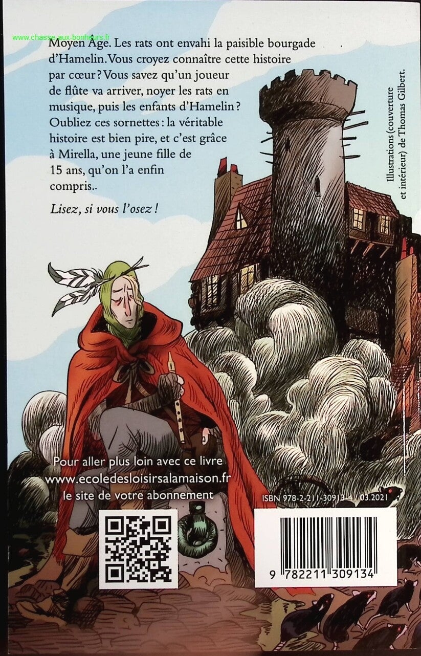 Moyen-Âge. Les rats ont envahi la paisible bourgade d'Hamelin. Vous croyez connaître cette histoire ? Vous savez qu'un joueur de flûte va arriver, noyer les rats en musique, puis les enfants d'Hamelin ? Oubliez ces sornettes. La véritable histoire est bien pire, et c'est grâce à Mirella, une jeune fille de quinze ans, qu'on l'a enfin compris. Cette crève la-faim a un don ignoré de tous : elle voit ce que personne d'autre ne voit. Par exemple, elle a repéré cet homme en noir qui murmure à l'oreille de ceux qui vont mourir de la peste... Et ça lui donne une sacrée longueur d'avance. Y compris sur le plus célèbre dératiseur de tous les temps