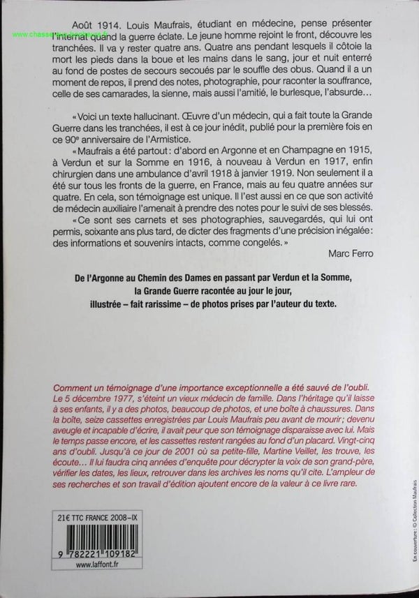 Août 1914. Louis Maufrais, étudiant en médecine, pense présenter l'internat quand la guerre éclate. Le jeune homme rejoint le front, découvre les tranchées. Il va y rester quatre ans. Quatre ans pendant lesquels il côtoie la mort les pieds dans la boue et les mains dans le sang, jour et nuit enterré au fond de postes de secours secoués par le souffle des obus. Quand il a un moment de repos, il prend des notes, photographie, pour raconter la souffrance, celle de ses camarades, la sienne, mais aussi l'amitié, le burlesque, l'absurde...