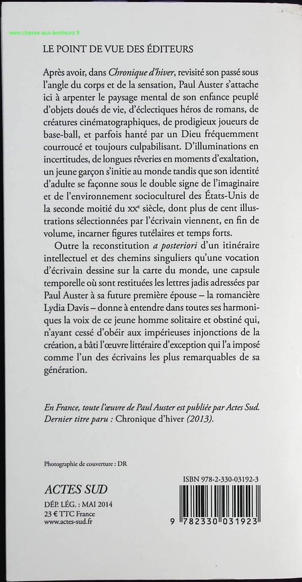 Après avoir, dans «Chronique d'hiver», revisité son passé sous l'angle du corps et de la sensation, Paul Auster s'attache ici à arpenter le paysage mental de son enfance peuplé d'objets doués de vie, d'éclectiques héros de romans, de créatures cinématographiques, de prodigieux joueurs de base-ball, et parfois hanté par un Dieu fréquemment courroucé et toujours culpabilisant. D'illuminations en incertitudes, de longues rêveries en moments d'exaltation, un jeune garçon s'initie au monde tandis que son identité d'adulte se façonne sous le double signe de l'imaginaire et de l'environnement socioculturel des États-Unis de la seconde moitié du xxe siècle, dont plus de cent illustrations sélectionnées par l'écrivain viennent, en fin de volume, incarner figures tutélaires et temps forts.