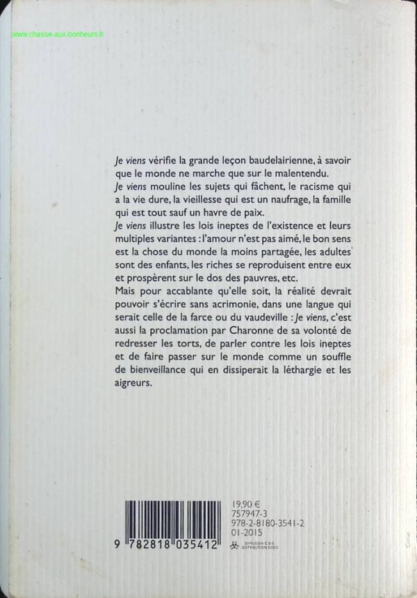Je viens vérifie la grande leçon baudelairienne, à savoir que le monde ne marche que sur le malentendu. Je viens mouline les sujets qui fâchent, le racisme qui a la vie dure, la vieillesse qui est un naufrage, la famille qui est tout sauf un havre de paix. Je viens illustre les lois ineptes de l'existence et leurs multiples variantes : l'amour n'est pas aimé, le bon sens est la chose du monde la moins partagée, les adultes sont des enfants, les riches se reproduisent entre eux et prospèrent sur le dos des pauvres, etc. Mais pour accablante qu'elle soit, la réalité devrait pouvoir s'écrire sans acrimonie, dans une langue qui serait celle de la farce ou du vaudeville : Je viens, c'est aussi la proclamation par Charonne de sa volonté de redresser les torts, de parler contre les lois ineptes et de faire passer sur le monde comme un souffle de bienveillance qui en dissiperait la léthargie et les aigreurs.