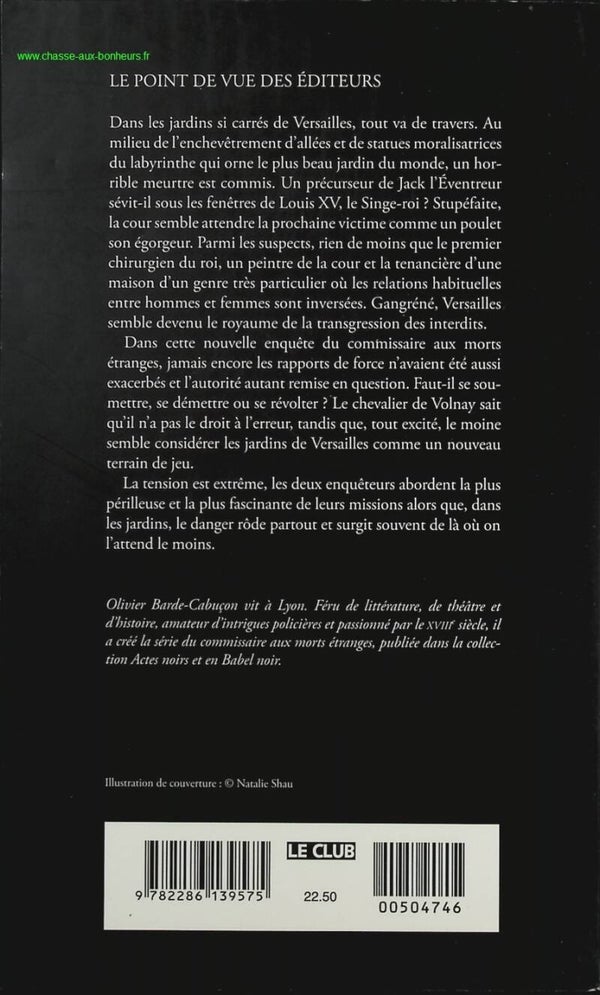 Dans les jardins si carrés de Versailles, tout va de travers. Au milieu de l'enchevêtrement d'allées et de statues moralisatrices du labyrinthe qui orne le plus beau jardin du monde, un horrible meurtre est commis. Un précurseur de Jack l'Éventreur sévit-il sous les fenêtres de Louis XV, le Singe-roi ? Stupéfaite, la cour semble attendre la prochaine victime comme un poulet son égorgeur. Parmi les suspects, rien de moins que le premier chirurgien du roi, un peintre de la cour et la tenancière d'une maison d'un genre très particulier où les relations habituelles entre hommes et femmes sont inversées. Gangréné, Versailles semble devenu le royaume de la transgression des interdits.