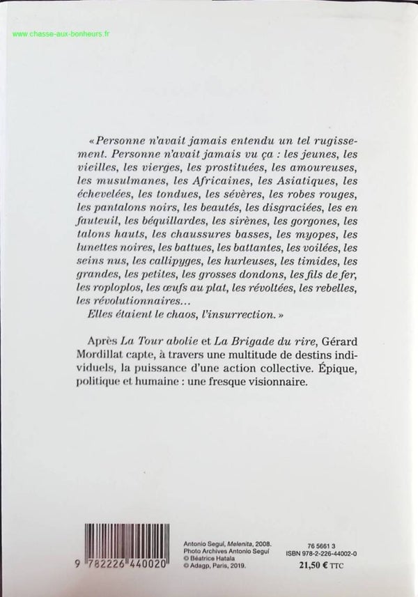 « Personne n'avait jamais entendu un tel rugissement. Personne n'avait jamais vu ça : les jeunes, les vieilles, les vierges, les prostituées, les amoureuses, les musulmanes, les Africaines, les Asiatiques, les échevelées, les tondues, les sévères, les robes rouges, les pantalons noirs, les beautés, les disgraciées, les en fauteuil, les béquillardes, les sirènes, les gorgones, les talons hauts, les chaussures basses, les myopes, les lunettes noires, les battues, les battantes, les voilées, les seins nus, les callipyges, les hurleuses, les timides, les grandes, les petites, les grosses dondons, les fils de fer, les roploplos, les oeufs au plat, les révoltées, les rebelles, les révolutionnaires...