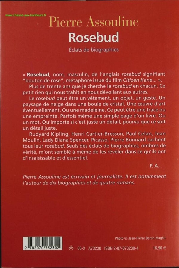 ""Rosebud, nom, masculin, de l'anglais rosebud signifiant 'bouton de rose', métaphore issue du film Citizen Kane..." Plus de trente ans que je cherche le rosebud en chacun. Ce petit rien qui nous trahit en nous dévoilant aux autres. Le rosebud peut être un vêtement, un objet, un geste. Un paysage de neige dans une boule de cristal. Une oeuvre d'art éventuellement. Ou une madeleine. Ce peut être une trace ou une empreinte. Parfois même une simple page d'un livre. Ou un mot. Qu'importe si c'est juste un détail, pourvu que ce soit un détail juste. Rudyard Kipling, Henri Cartier-Bresson, Paul Celan, Jean Moulin, Lady Diana Spencer, Picasso, Pierre Bonnard cachent tous leur rosebud. Seuls des éclats de biographies, ombres de vérité, m'ont semblé à même de les révéler dans ce qu'ils ont d'insaisissable et d'essentiel." Pierre Assouline.