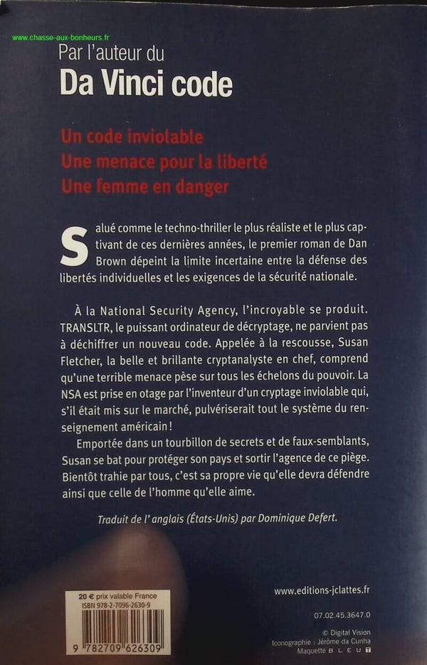 Lorsque le super-ordinateur de décryptage de la NSA ne parvient pas à déchiffrer un code, l'agence appelle à la rescousse sa cryptanalyste en chef, Susan Fletcher, une belle et brillante mathématicienne. Ce que va découvrir Susan ébranle tous les échelons du pouvoir : la NSA est prise en otage - non sous la menace d'une arme ou d'une bombe, mais par un système de cryptage inviolable qui, s'il était mis sur le marché, pulvériserait tout le renseignement américain !