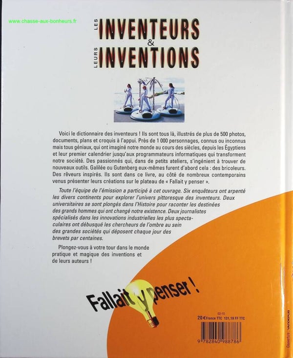 Voici le dictionnaire des inventeurs ! Ils sont tous là, illustrés de plus de 500 photos, documents, plans et croquis à l'appui. Près de 1 000 personnages, connus ou inconnus mais tous géniaux, qui ont imaginé notre monde au cours des siècles, depuis les Égyptiens et leur premier calendrier jusqu'aux programmateurs informatiques qui transforment notre société. Des passionnés qui, dans de petits ateliers, s'ingénient à trouver de nouveaux outils. Galilée ou Gutenberg eux-mêmes furent d'abord cela : des bricoleurs. Des rêveurs inspirés. Ils sont dans ce livre, au côté de nombreux contemporains venus présenter leurs créations sur le plateau de " Fallait y penser ". Toute l'équipe de l'émission a participé à cet ouvrage. Six enquêteurs ont arpenté les divers continents pour explorer l'univers pittoresque des inventeurs. Deux universitaires se sont plongés dans l'Histoire pour raconter les destinées des grands hommes qui ont changé notre existence. Deux journalistes spécialisés dans les innovations industrielles les plus spectaculaires ont débusqué les chercheurs de l'ombre au sein des grandes sociétés qui déposent chaque jour des brevets par centaines. Plongez-vous à votre tour dans le monde pratique et magique des inventions et de leurs auteurs !