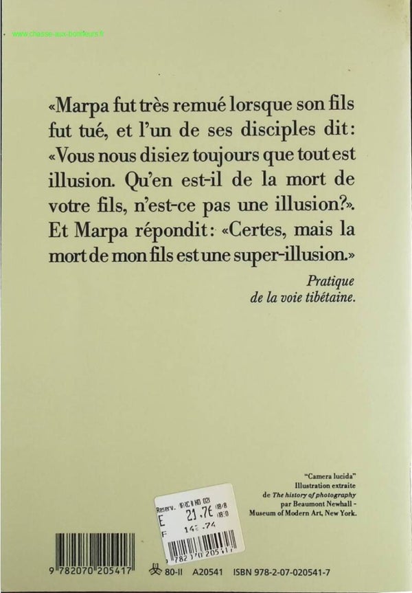 "Marpa fut très remué lorsque son fils fut tué, et l'un de ses disciples dit : "Vous nous disiez toujours que tout est illusion. Qu'en est-il de la mort de votre fils, n'est-ce pas une illusion ?". Et Marpa répondit : "Certes, mais la mort de mon fils est une super-illusion."" Pratique de la voie tibétaine.