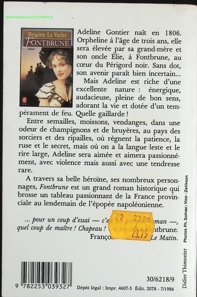 Adeline Gontier naît en 1806. Orpheline à l'âge de trois ans, elle sera élevée par sa grand-mère et son oncle. Elie, à Fontbrune, au cœur du Périgord noir. Sans dot, son avenir paraît bien incertain.... Mais Adeline est riche d'une excellent nature : énergique, audacieuse, pleine de bon sens, adorant la vie et dotée d'un tempérament de feu. Quelle gaillarde ! Entre semailles, moissons, vendanges, dans une odeur de champignons et de bruyères, au pays des sorciers et des ripailles, où règnent la patience, la ruse et le secret, mais où on a la langue leste et le rire large, Adeline sera aimée et aimera passionnément, avec violence, mais aussi avec une tendresse rare. A travers sa belle héroïne, ses nombreux personnages Fontbrune est un grand roman historique qui brosse un tableau passionnant de la France provinciale au lendemain de l'épopée napoléonienne.