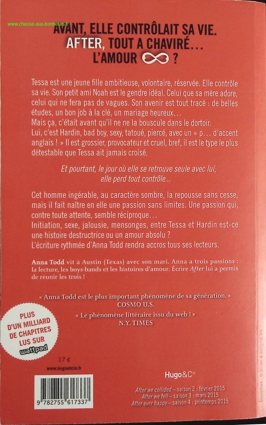 Lui, c'est Hardin, bad boy, sexy, tatoué, piercé, avec un « p... d'accent anglais ! » Il est grossier, provocateur et cruel, bref, il est le type le plus détestable que Tessa ait jamais croisé.