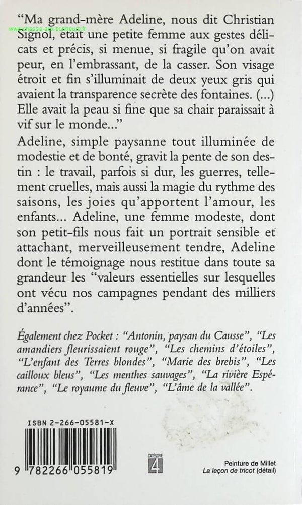 " Ma grand-mère Adeline, nous dit Christian Signol, était une petite femme aux gestes délicats et précis, si menue, si fragile qu'on avait peur, en l'embrassant, de la casser. Son visage étroit et fin s'illuminait de deux yeux gris qui avaient la transparence secrète des fontaines (...) Elle avait la peau si fine que sa chair paraissait à vif sur le monde... " Adeline, simple paysanne tout illuminée de modestie et de bonté, gravit la pente de son destin : le travail, parfois si dur, les guerres, tellement cruelles, mais aussi la magie du rythme des saisons, les joies qu'apportent l'amour, les enfants... Adeline, une femme modeste, dont son petit-fils nous fait un portrait sensible et attachant, merveilleusement tendre, Adeline dont le témoignage nous restitue dans toute sa grandeur les " valeurs essentielles sur lesquelles ont vécu nos campagnes pendant des milliers d'années ".