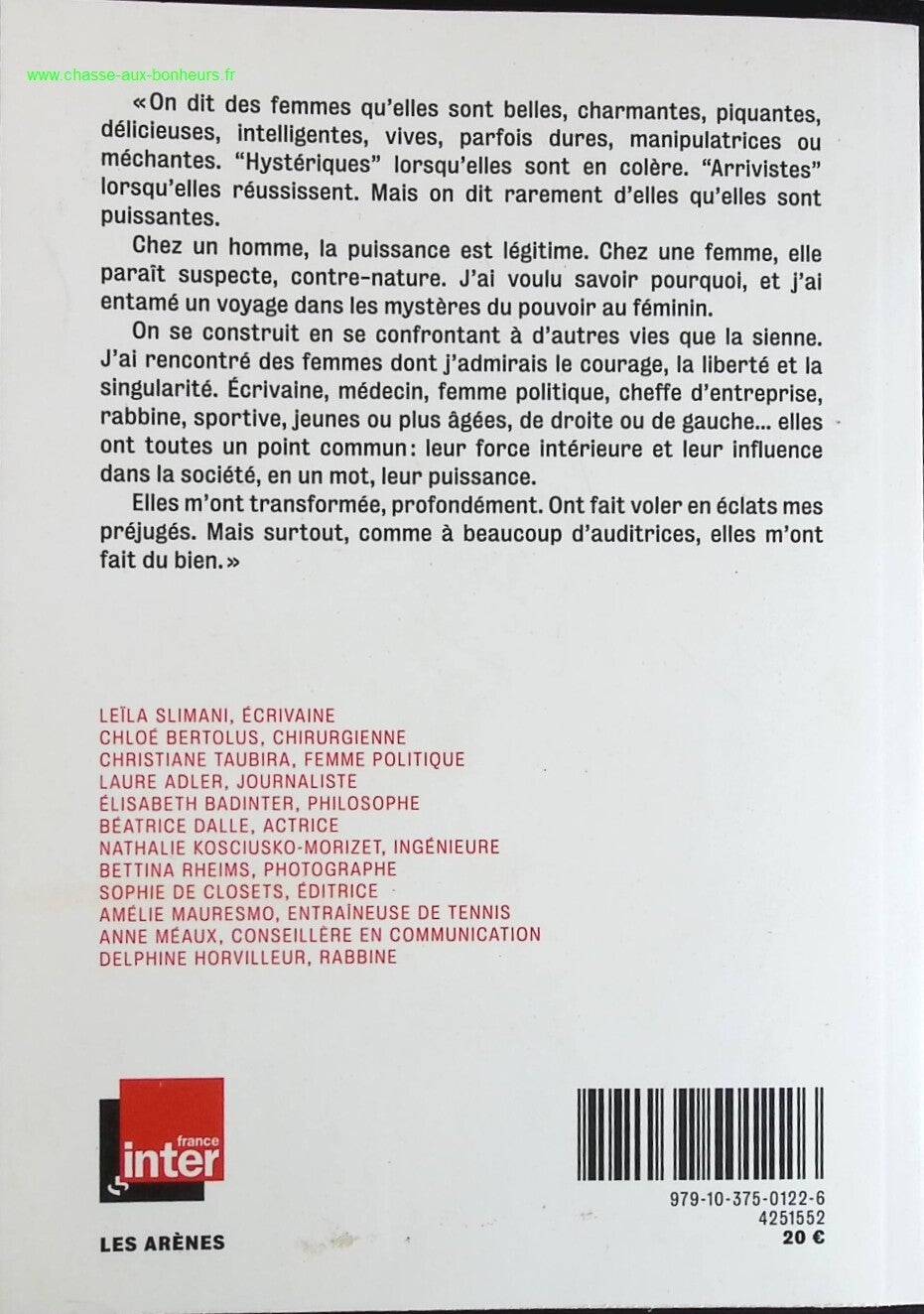 On se construit en se confrontant à d'autres vies que la sienne. J'ai rencontré des femmes dont j'admirais le courage, la liberté et la singularité. Écrivaine, médecin, femme politique, cheffe d'entreprise, rabbine, sportive, jeunes ou plus âgées, de droite ou de gauche... elles ont toutes un point commun : leur force intérieure et leur influence dans la société, en un mot, leur puissance. Elles m'ont transformée, profondément. Ont fait voler en éclats mes préjugés. Mais surtout, comme à beaucoup d'auditrices, elles m'ont fait du bien. "