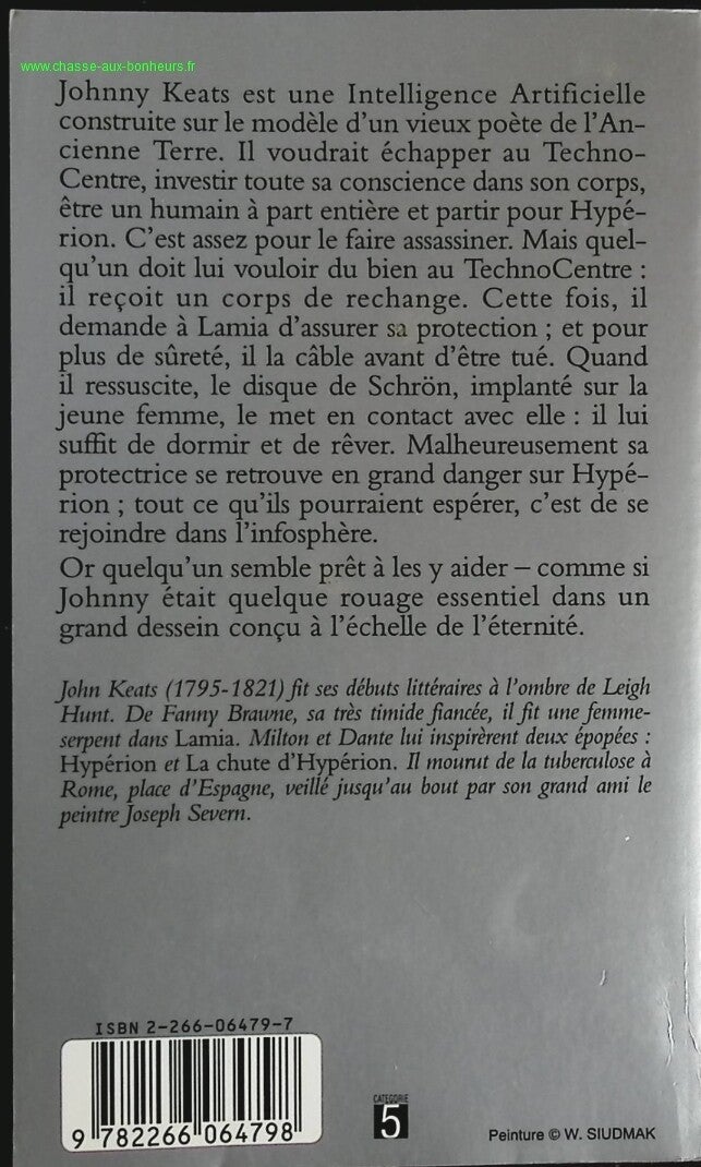Johnny Keats est une Intelligence Artificielle construite sur le modèle d'un vieux poète de l'Ancienne Terre. Il voudrait échapper au TechnoCentre, investir toute sa conscience dans son corps, être un humain à part entière et partir pour Hypérion. C'est assez pour le faire assassiner. Mais quelqu'un doit lui vouloir du bien au TechnoCentre : il reçoit un corps de rechange. Cette fois, il demande à Lamia d'assurer sa protection ; et pour plus de sûreté, il la câble avant d'être tué. Quand il ressuscite, le disque de Schrön, implanté sur la jeune femme, le met en contact avec elle : il lui suffit de dormir et de rêver. Malheureusement sa protectrice se retrouve en grand danger sur Hypérion ; tout ce qu'ils pourraient espérer, c'est de se rejoindre dans l'infosphère. Or, quelqu'un semble prêt à les y aider - comme si Johnny était quelque rouage essentiel dans un grand dessein conçu à l'échelle de l'éternité.