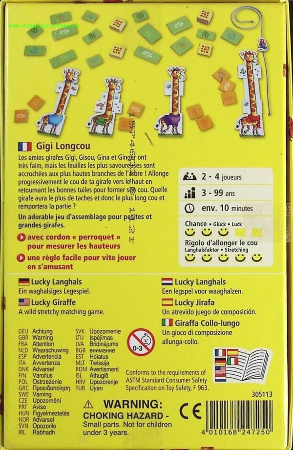 Les amies girafes sont affamées, mais les feuilles les plus savoureuses sont accrochées à la cime de l'arbre. A tour de rôle, les joueurs retournent des tuiles (qui n'ont pas toutes le même nombre de taches) et les posent pour allonger le cou de leur girafe. La girafe au plus long cou remportera la partie. Nombre de joueurs 2. Durée de la partie 10 minutes.