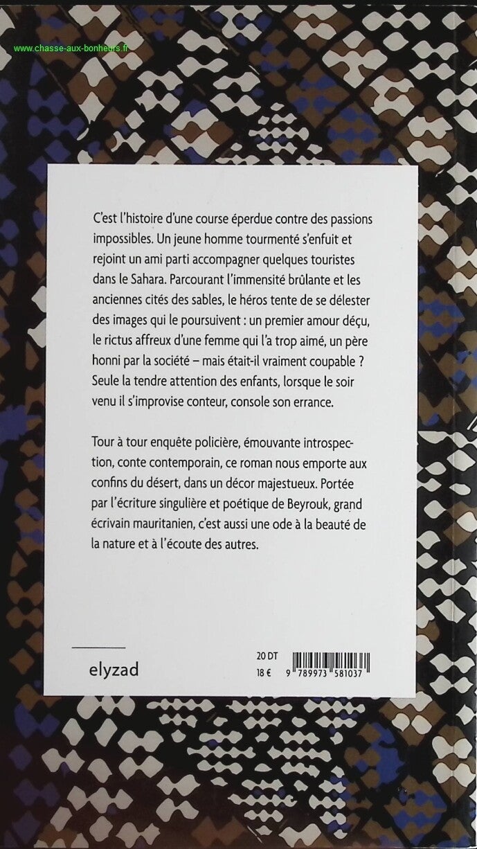 C'est l'histoire d'une course éperdue contre des passions impossibles. Un jeune homme tourmenté s'enfuit et rejoint un ami parti accompagner quelques touristes dans le Sahara. Parcourant l'immensité brûlante et les anciennes cités des sables, le héros tente de se délester des images qui le poursuivent : un premier amour déçu, le rictus affreux d'une femme qui l'a trop aimé, un père honni par la société – mais était-il vraiment coupable ? Seule la tendre attention des enfants, lorsque le soir venu il s'improvise conteur, console son errance. Tour à tour enquête policière, émouvante introspection, conte contemporain, ce roman nous emporte aux confins du désert, dans un décor majestueux. Portée par l'écriture singulière et poétique de Beyrouk, grand écrivain mauritanien, c'est aussi une ode à la beauté de la nature et à l'écoute des autres.