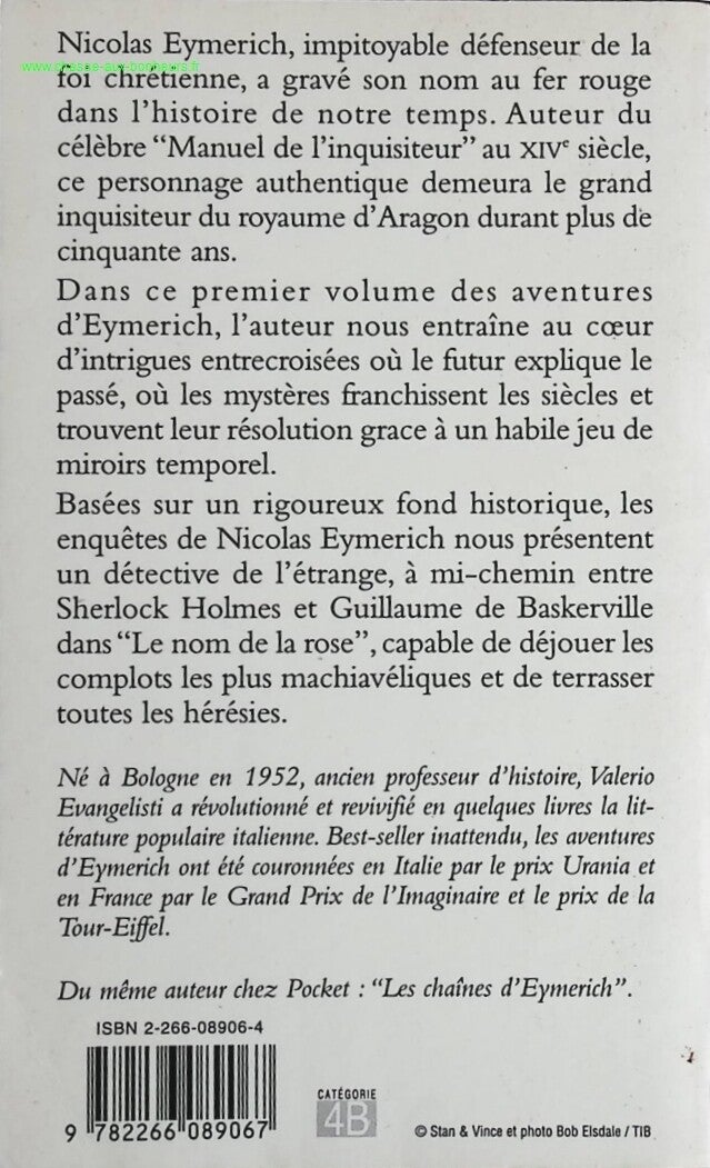 Nicolas Eymerich, impitoyable défenseur de la foi chrétienne, a gravé son nom au fer rouge dans l'histoire de notre temps. Auteur du célèbre " Manuel de l'inquisiteur " au XIVe siècle, ce personnage authentique demeura le grand inquisiteur du royaume d'Aragon durant plus de cinquante ans. Dans ce premier volume des aventures d'Eymerich, l'auteur nous entraîne au cœur d'intrigues entrecroisées où le futur explique le passé, où les mystères franchissent les siècles et trouvent leur résolution grâce à un habile jeu de miroirs temporels. Basées sur un rigoureux fond historique, les enquêtes de Nicolas Eymerich nous présentent un détective de l'étrange, à mi-chemin entre Sherlock Holmes et Guillaume de Baskerville dans " Le nom de la rose ", capable de déjouer les complots les plus machiavéliques et de terrasser toutes les hérésies.