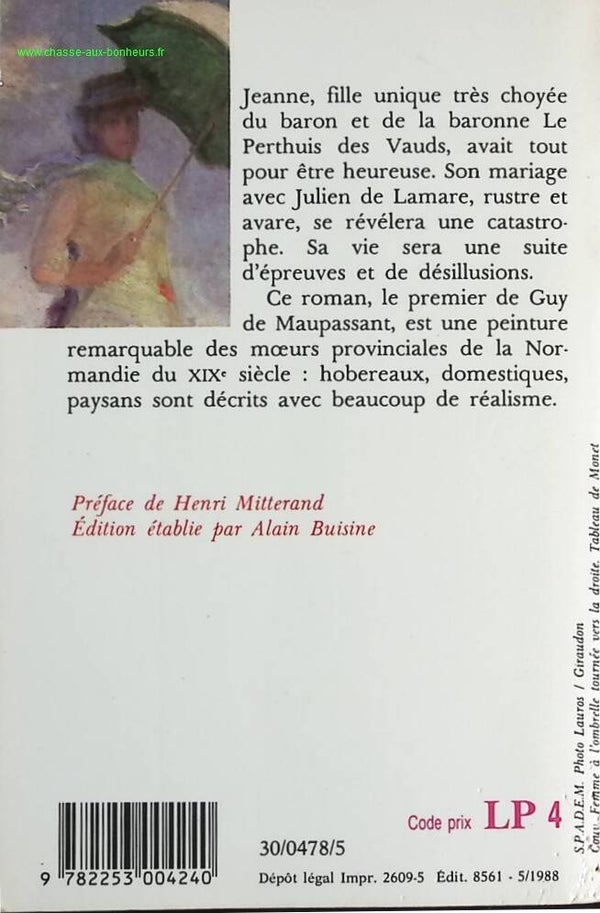Jeanne, fille unique très choyée du baron et de la baronne Le Perthuis des Vauds, avait tout pour être heureuse. Son mariage avec Julien de Lamare, rustre et avare, se révélera une catastrophe. Sa vie sera une suite d'épreuves et de désillusions.