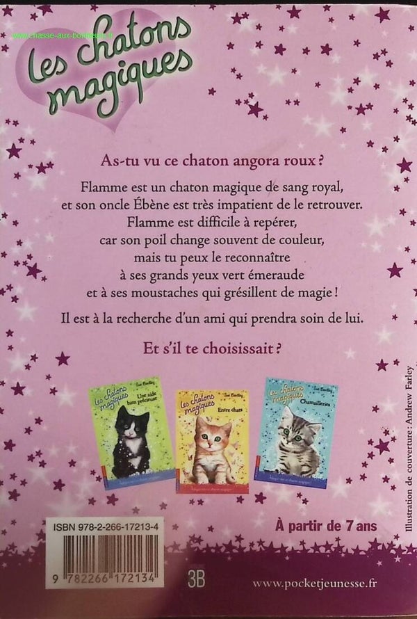 Flamme est un chaton magique de sang royal, et son oncle Ébène est très impatient de le retrouver. Flamme est difficile à repérer, car son poil change souvent de couleur, mais tu peux le reconnaître à ses grands yeux vert émeraude et à ses moustaches qui grésillent de magie !
