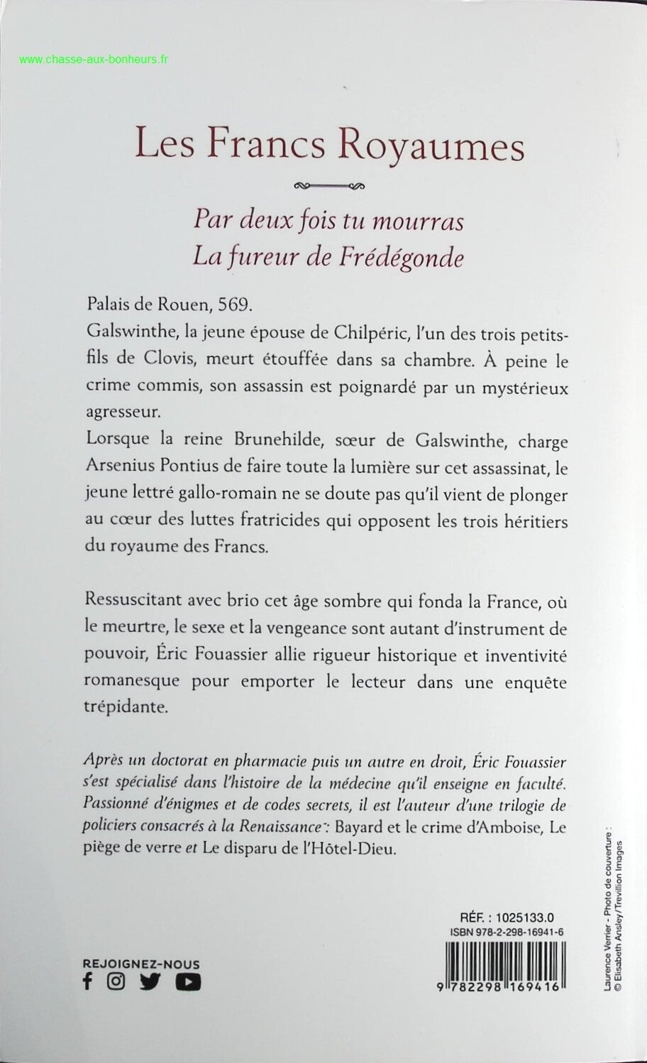Palais de Rouen, en l’an 569. Galswinthe, la jeune épouse de Chilpéric, l’un des trois petits-fils de Clovis, meurt étouffée dans sa chambre. À peine le crime commis, son assassin est poignardé par un mystérieux agresseur. Lorsque la reine Brunehilde d’Austrasie, sœur de Galswinthe, charge Arsenius Pontius de faire toute la lumière sur cet assassinat, le jeune lettré gallo-romain ne se doute pas qu’il vient de plonger au cœur des luttes fratricides qui opposent les trois héritiers du royaume des Francs. Avec le premier tome de de ce dyptique sur les rois mérovingiens, Éric Fouassier offre aux lecteurs un formidable polar historique et ressuscite somptueusement cet âge sombre qui fonda la France, où meurtre, sexe et vengeance sont autant d’instruments de pouvoir.