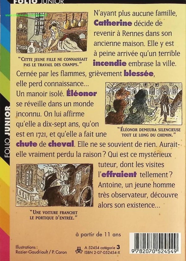 N'ayant plus aucune famille, Catherine décide de revenir à Rennes dans son ancienne maison. Elle y est à peine arrivée qu'un terrible incendie embrase la ville. Cernée par les flammes, grièvement blessée, elle perd connaissance...Un manoir isolé. Éléonor se réveille dans un monde inconnu. On lui affirme qu'elle a 17 ans, qu'on est en 1721, et qu'elle a fait une chute de cheval. Elle ne se souvient de rien. Aurait-elle vraiment perdu la raison ? Qui est ce mystérieux tuteur, dont les visites l'effraient tellement ?Antoine, un jeune homme très observateur, découvre alors son existence...