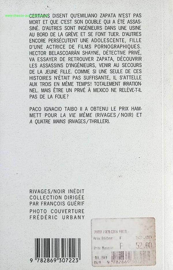 Certains disent qu'Emiliano Zapata n'est pas mort et que c'est son double qui a été assassiné. D'autres sont ingénieurs dans une usine au bord de la grève et se font tuer. D'autres encore persécutent une adolescente, fille d'une actrice de films pornographiques. Héctor Belascoarán Shayne, détective privé, va essayer de retrouver Zapata, découvrir les assassins d'ingénieurs et de venir au secours de la jeune fille. Comme si une seule de ces histoires n'était pas suffisante, il s'attelle aux trois en même temps ! Totalement irrationnel. Mais être un privé à Mexico ne relève-t-il pas de la folie ?