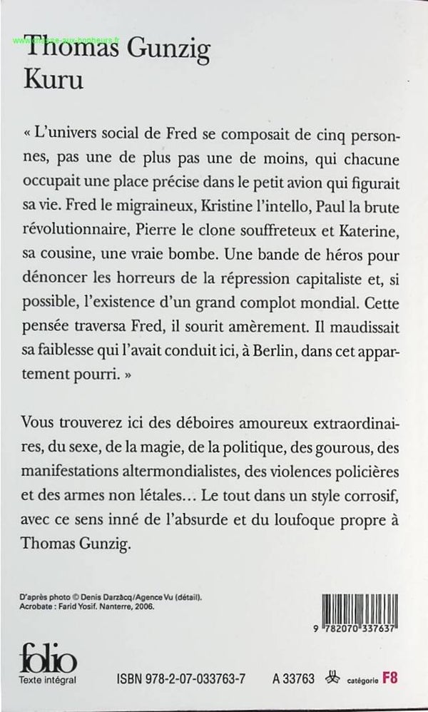 "L'univers social de Fred se composait de cinq personnes, pas une de plus pas une de moins, qui chacune occupait une place précise dans le petit avion qui figurait sa vie. Fred le migraineux, Kristine l'intello, Paul la brute révolutionnaire, Pierre le clone souffreteux et Katerine, sa cousine, une vraie bombe. Une bande de héros pour dénoncer les horreurs de la répression capitaliste et, si possible, l'existence d'un grand complot mondial. Cette pensée traversa Fred, il sourit amèrement. Il maudissait sa faiblesse qui l'avait conduit ici, à Berlin, dans cet appartement pourri." Vous trouverez ici des déboires amoureux extraordinaires, du sexe, de la magie, de la politique, des gourous, des manifestations altermondialistes, des violences policières et des armes non létales... Le tout dans un style corrosif, avec ce sens inné de l'absurde et du loufoque propre à Thomas Gunzig.