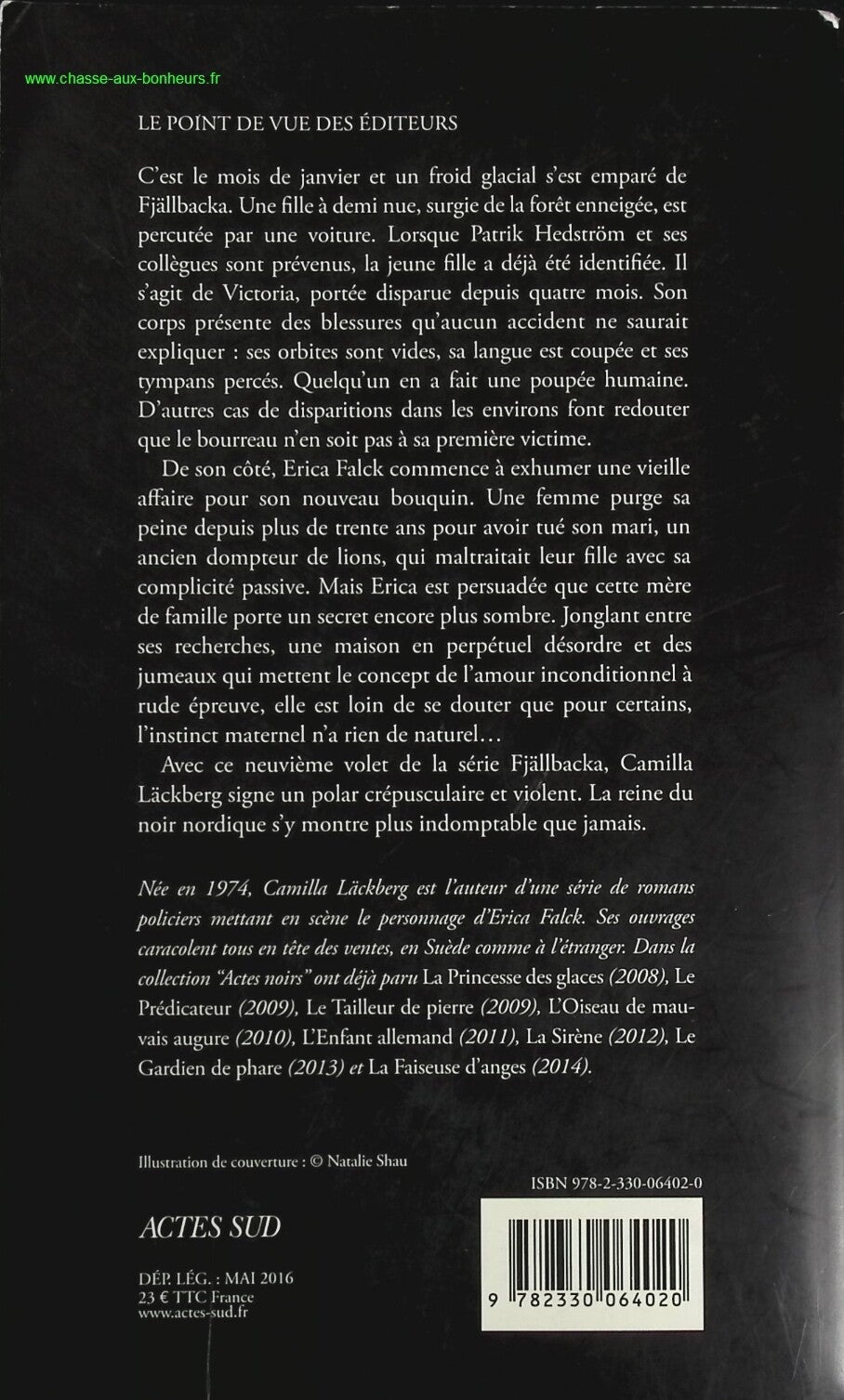 C'est le mois de janvier et un froid glacial s'est emparé de Fjällbacka. Une fille à demi nue, surgie de la forêt enneigée, est percutée par une voiture. Lorsque Patrik Hedström et ses collègues sont prévenus, la jeune fille a déjà été identifiée. Il s'agit de Victoria, portée disparue depuis quatre mois. Son corps présente des blessures qu'aucun accident ne saurait expliquer : ses orbites sont vides, sa langue est coupée et ses tympans percés. Quelqu'un en a fait une poupée humaine. D'autres cas de disparitions dans les environs font redouter que le bourreau n'en soit pas à sa première victime.